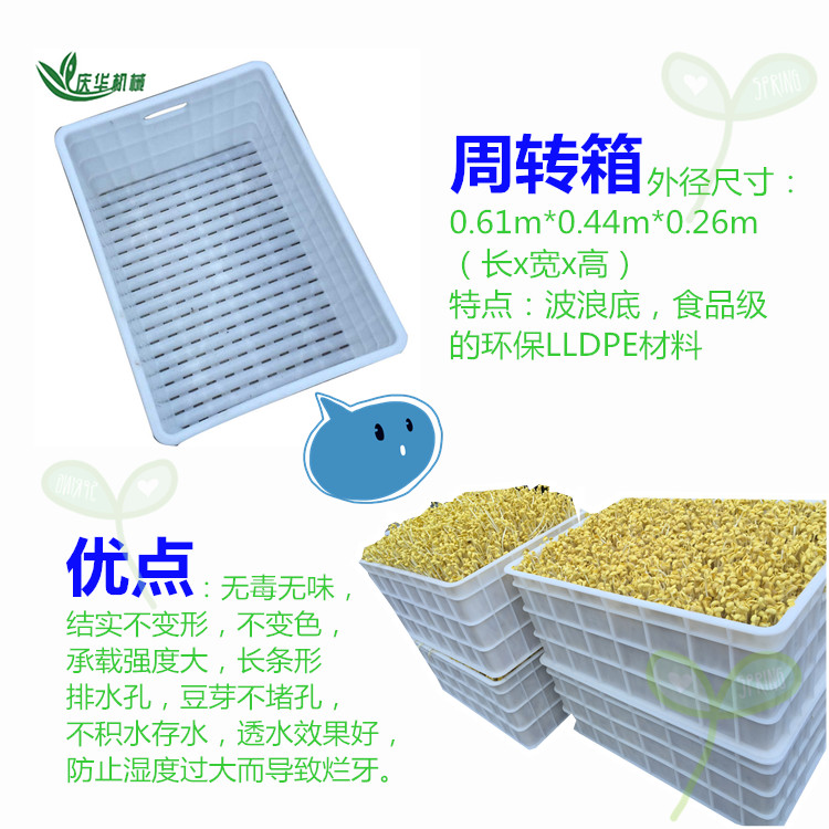 5)減少爛芽現(xiàn)象。豆芽生長(zhǎng)的爛芽現(xiàn)象多發(fā)生在培育后的三天左右,由于手工生產(chǎn)豆芽的周期長(zhǎng),易出現(xiàn)爛芽現(xiàn)象,然而采用豆芽機(jī)生產(chǎn),三天左右豆芽已經(jīng)成熟,可以采收食用,不會(huì)有爛芽現(xiàn)象發(fā)生。 6、豆芽機(jī)結(jié)構(gòu)特點(diǎn)及功能(可根據(jù)客戶需要訂做): 4)周轉(zhuǎn)箱的外徑尺寸:0.61m*0.44m*0.26m(長(zhǎng)寬高),特點(diǎn):波浪底,食品級(jí)的環(huán)保LLDPE材料,無(wú)味,結(jié)實(shí)不變形,不變色,承載強(qiáng)度大,長(zhǎng)條形排水孔,豆芽不堵孔,不積水存水,透水效果好,防止?jié)穸冗^(guò)大而導(dǎo)致?tīng)€牙。 7、價(jià)格:價(jià)格即可購(gòu)得